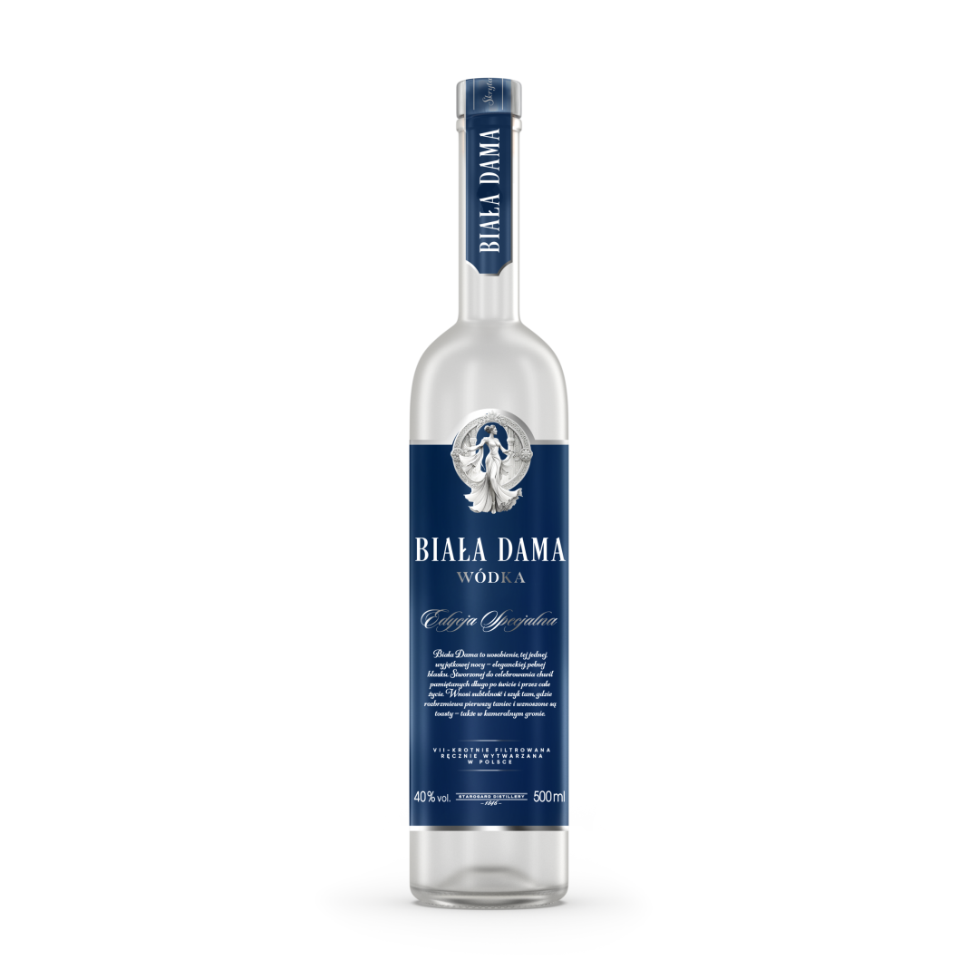 Elegancka butelka i klasyczny design podkreślają prestiż wódki, odzwierciedlając tradycję i wysokie standardy wytwarzania. Każda kropla Białej Damy oferuje harmonijną kompozycję smaku, klarowność i wyjątkową jakość, tworząc wrażenia godne wódki premium.