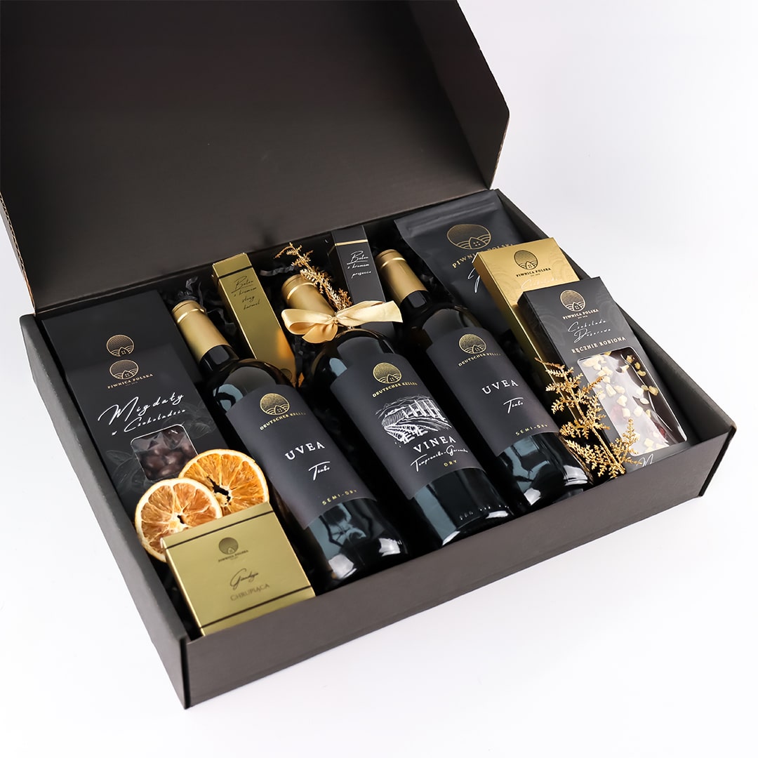 Ten zestaw upominkowy z winem i słodyczami premium został stworzony z myślą o osobach, które cenią różnorodność smaków, wysoką jakość i elegancką formę prezentu. To bogata propozycja, która doskonale sprawdzi się jako prezent biznesowy, upominek świąteczny, a także stylowy prezent dla bliskiej osoby.